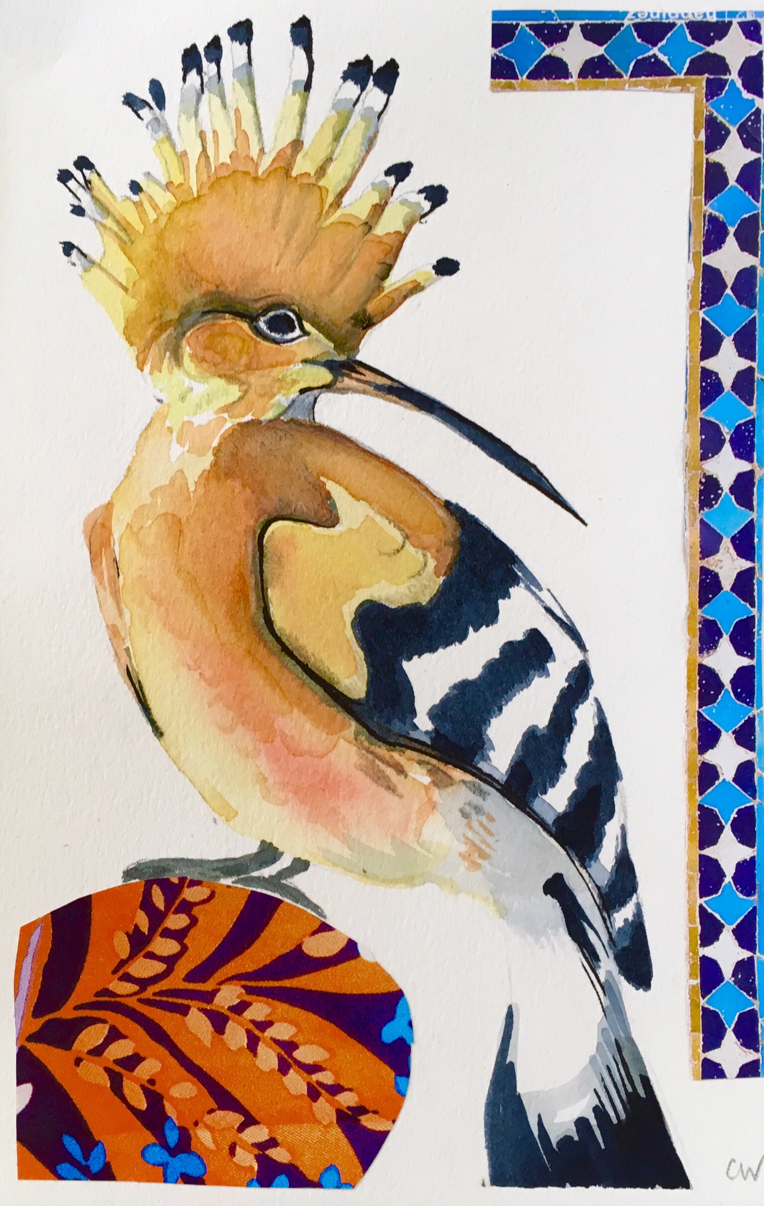 Today’s collage is mostly water colour with just a little decorative collage because I had plenty of time. Is he sitting on a giant patterned egg? I wonder what bird of paradise would hatch from this?
