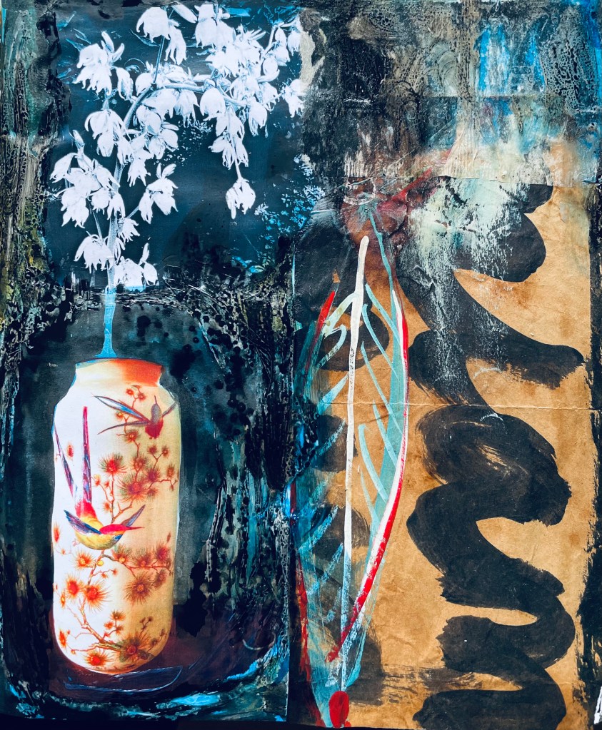 Practice with materials leads to and becomes part of the exploration. Wider aesthetic thinking occurs (something we in the West have largely lost) which leads to thought and words. Afterwards I might write or just ponder as I garden or cook or do the daily tasks. Sometimes there is a notion of an imprinting in the body (embodiment), the book is closed and other life is resumed. Closure….for now.