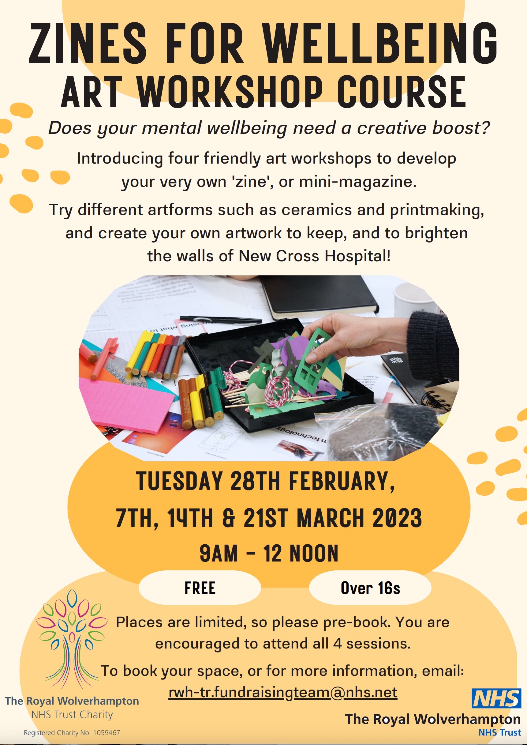 My date is March 14th 2023 from 9-12am, where we will combine fun self portraits, positivity, relaxation and letting go of what no longer serves us well. The venue is Wolverhampton Art Gallery. Please email rah-tr.fundraisingteam@nhs.net to book – not me!